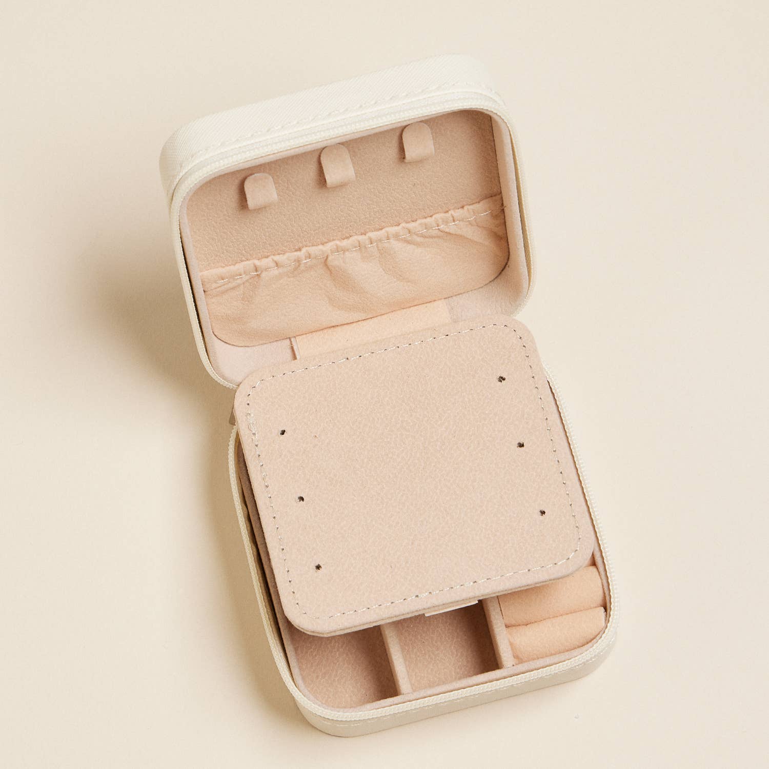 This is a compact square jewelry box with a charming and delicate design. Its exterior features a soft white background adorned with a repeated pattern of light pink bows, arranged in a diagonal grid. The material has a textured finish, giving it a premium feel. The box is secured with a gold-toned zipper and a matching pull tab, adding a touch of elegance. A small handle on the top makes it convenient to carry, making it ideal for travel or everyday use. This jewelry box is perfect for organizing and storing accessories in a stylish and feminine way.