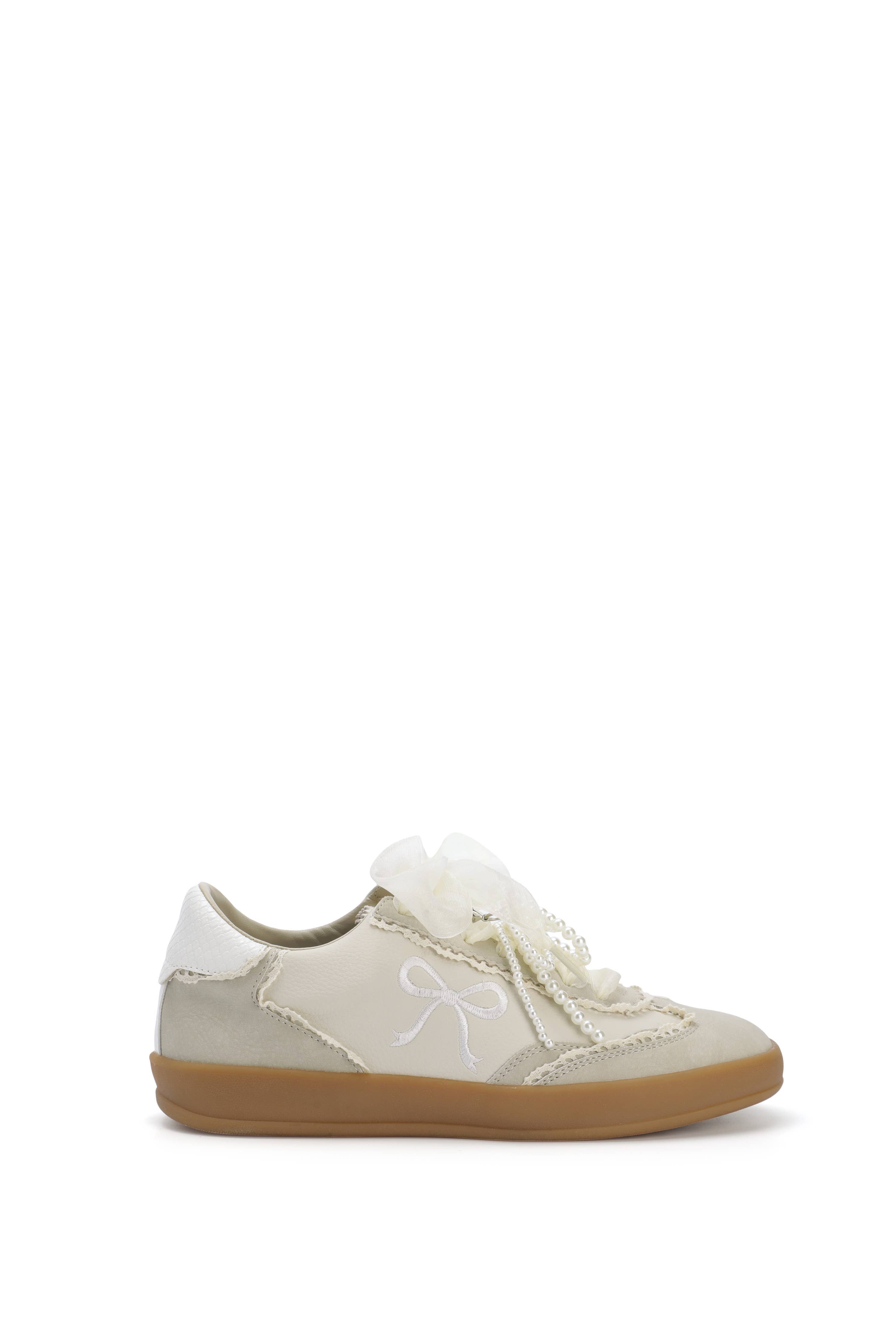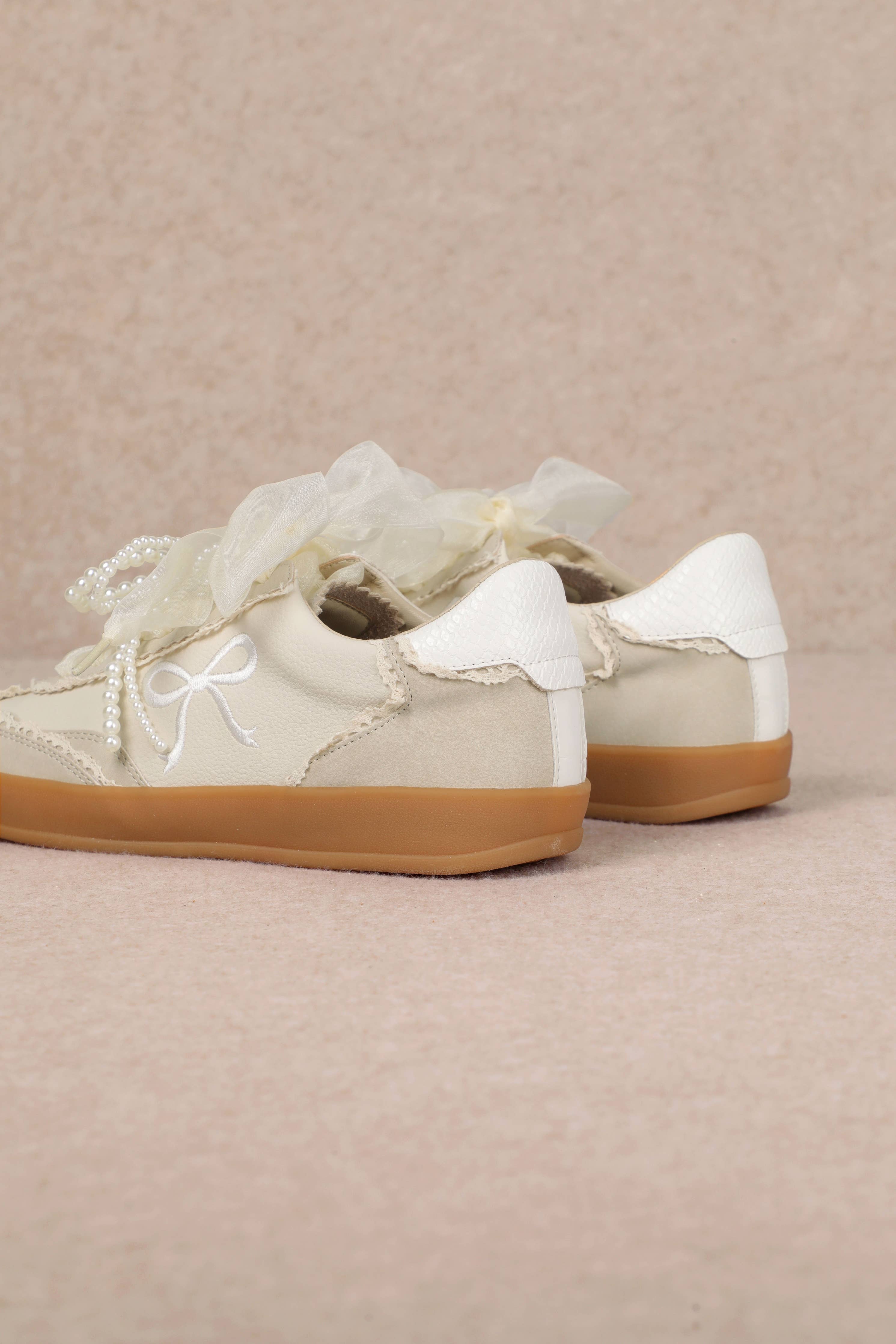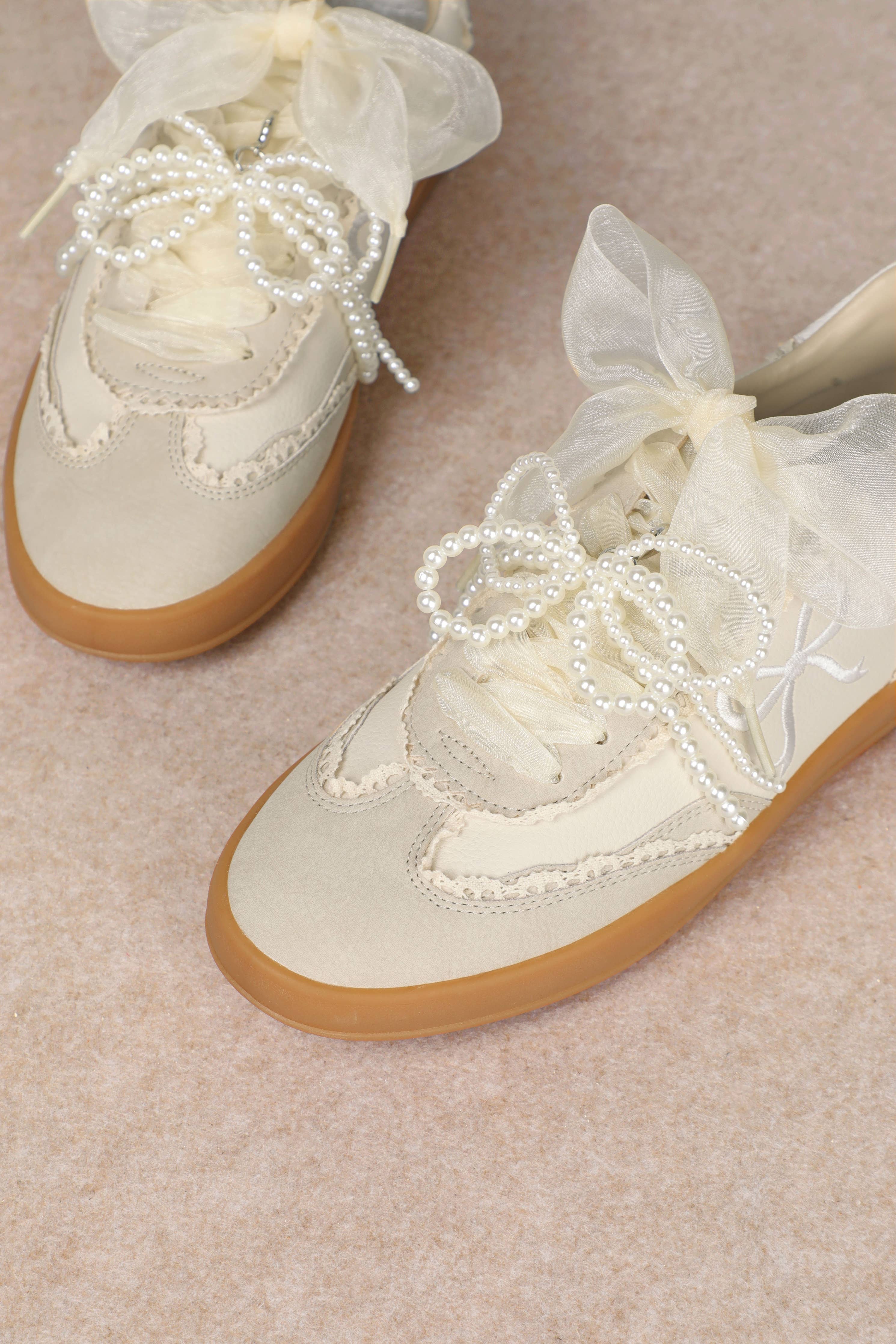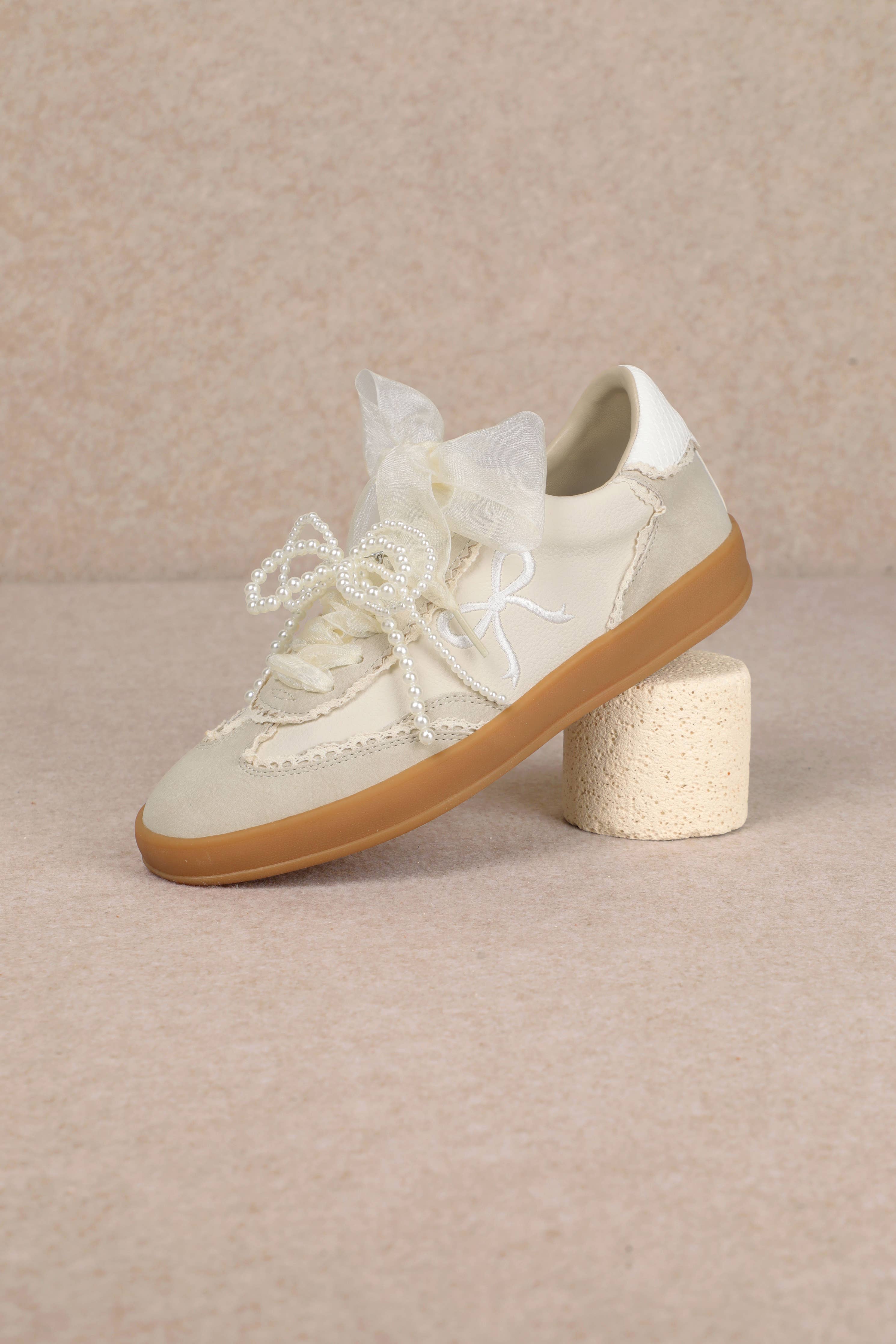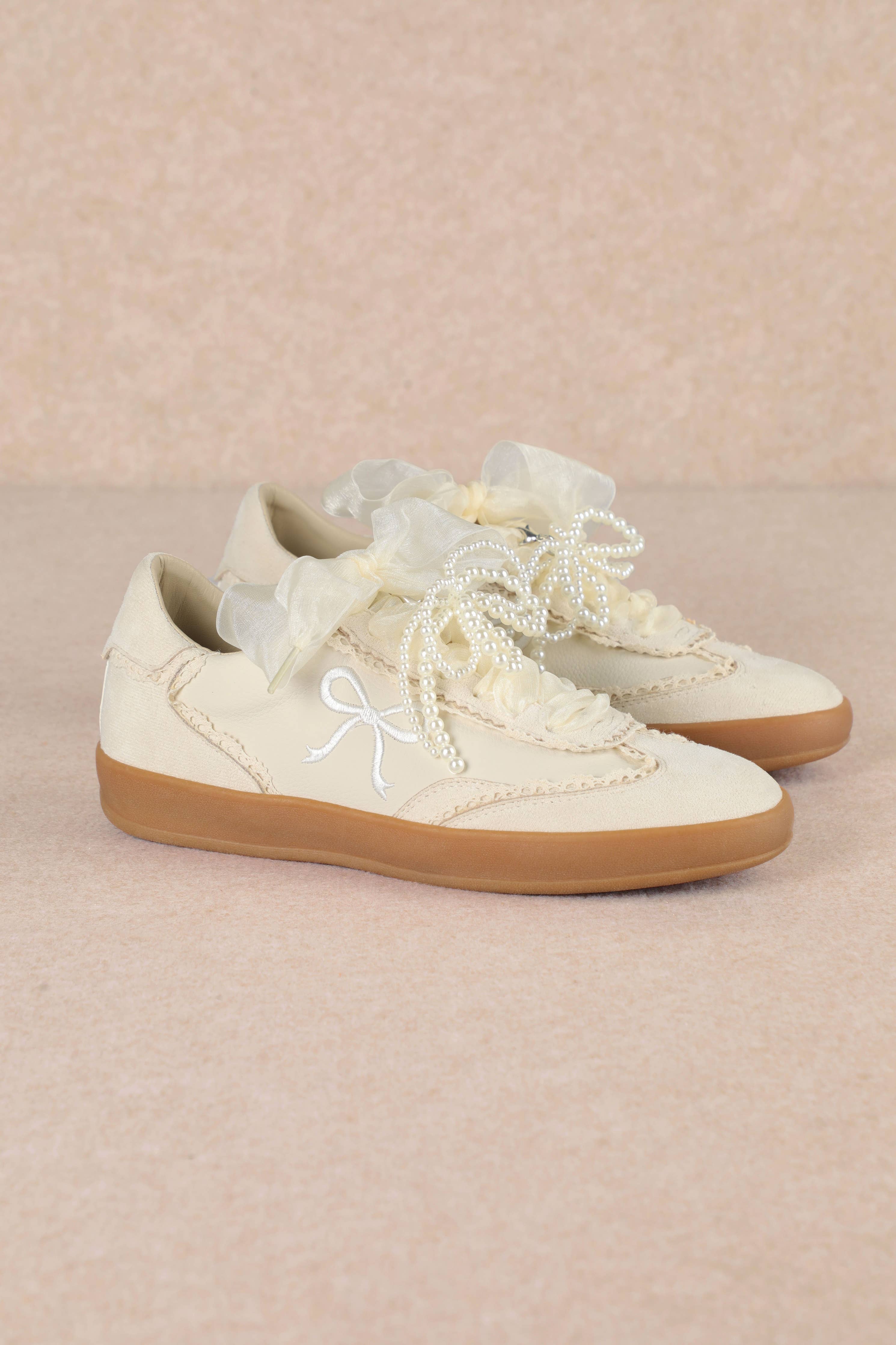 The Sneaker is where playful romance meets casual chic. Designed in soft cream tones with a gum sole, this sneaker is elevated by whimsical details-sheer ribbon laces, pearl accents, and embroidered bow motifs. Feminine yet wearable, Julie is the perfect pair for adding a touch of elegance to everyday outfits or dressing down with a polished twist.